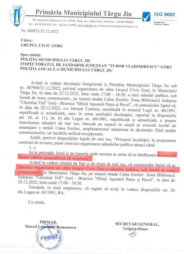 Primăria Târgu Jiu INTERZICE organizarea Marșului comemorativ „Restitutio in integrum – Calea Eroilor”, organizat de Grupul Civic Gorj, acțiune ce urma să se desfășoare vineri, 23 decembrie 2022, la Târgu Jiu, pe traseul: str. Calea Eroilor – Biblioteca Județeană „Christian Tell” – Biserica „Sf. Apostoli Petru și Pavel”.