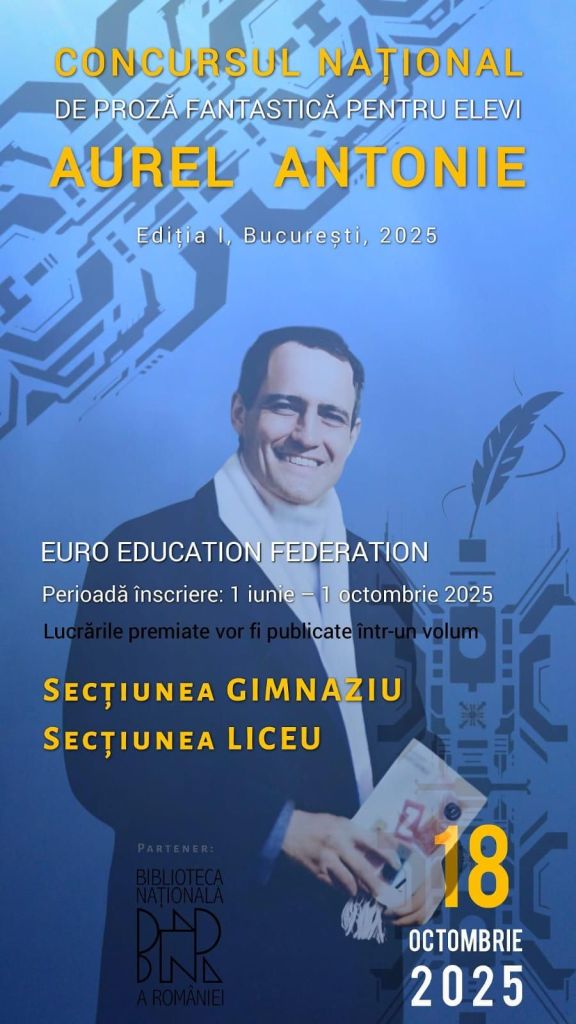 Concursul Național de Proză Fantastică pentru Elevi „Aurel Antonie”, Ediția I, debutează în 2025 la București, fiind un eveniment cultural dedicat creativității literare a tinerilor din întreaga țară. Organizat de Euro Education Federation, concursul se adresează elevilor pasionați de literatură și universuri imaginative, oferindu-le ocazia să-și exprime talentul și să pătrundă în lumea fascinantă a prozei fantastice.